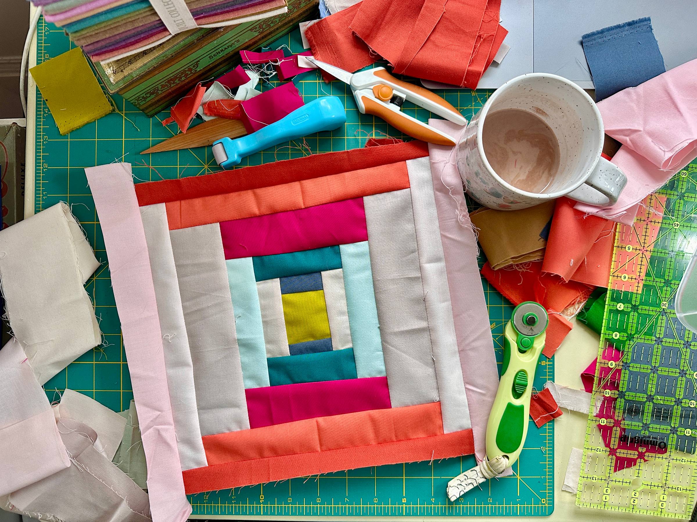 The essentials are a rotary cutter, cutting mat, and quilting ruler. If you're choosing just one ruler for this project, a 6" x 24" is your best friend, it's the perfect length for cutting strips across the width of fabric/fat quarter, which is exactly how we work through the workroom Notes.